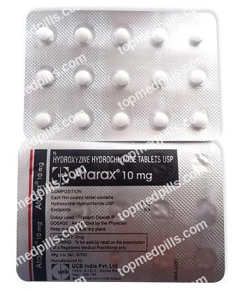 Atarax has a sedative and anxiolitic effect. It is an antihistamine with anticholinergic and sedative properties used to treat allergy. It positively affects cognitive abilities, improves memory and attention. The medication does not cause psychological dependence and addiction. It relaxes smooth muscles, has a bronchodilator and analgetic effect as well as moderately inhibits gastric secretion, it may be used as antiemetic and myorelaxant. Hydroxyzine reduces itching from hives, eczema, dermatitis, etc. After ingestion Hydroxyzine is converted to its active form named cetirizine (Zyrtec). Both hydroxyzine and cetirizine act as antihistamines.
